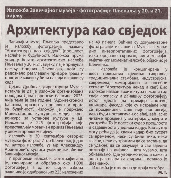 Чланак у Пљеваљским новинама о изложби „Архитектура као свједок – прошлост, насљеђе и будућност“ која пружа увид у богато архитектонско наслеђе Пљеваља XX и XXI вијека.